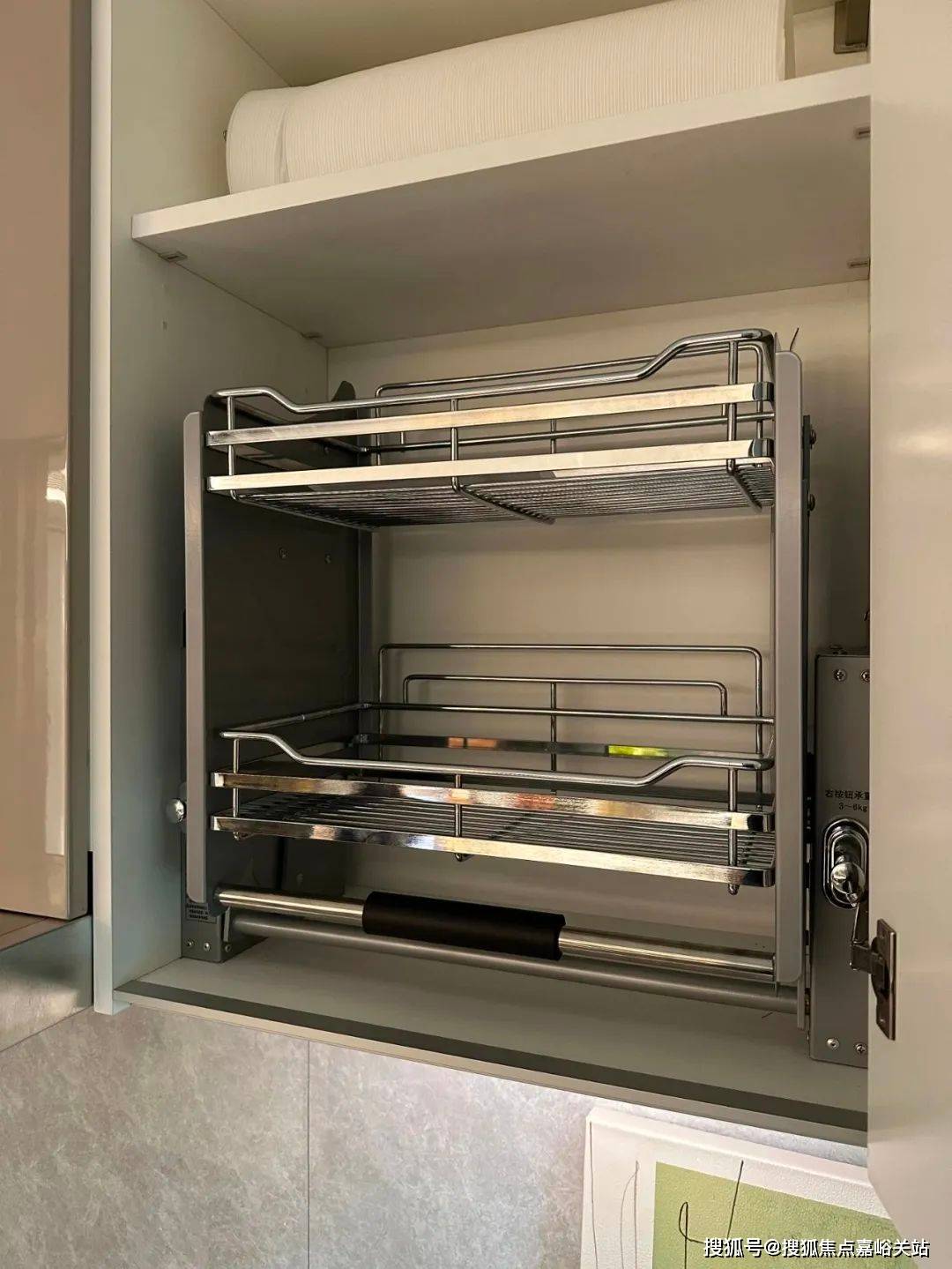 橱柜作为强功能性的收纳系统,自然少不了操作性能上的考究,吊柜做了升降式的拉篮,以后再也不用爬上高凳拿取了。