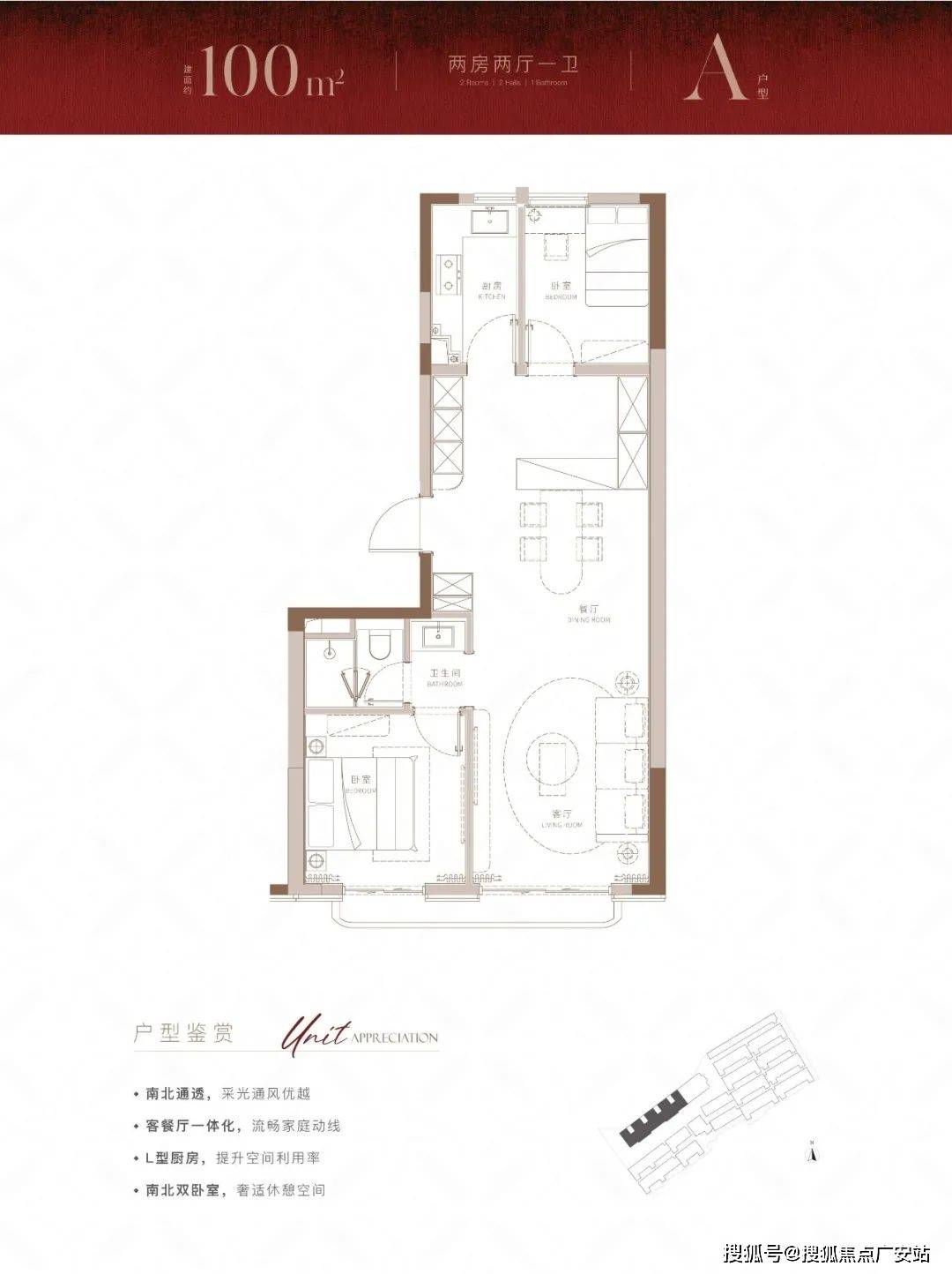 建面约100m²大2房户型,带来的不仅是方正的布局,也为购房者带来了体验感超绝的视野和采光。
