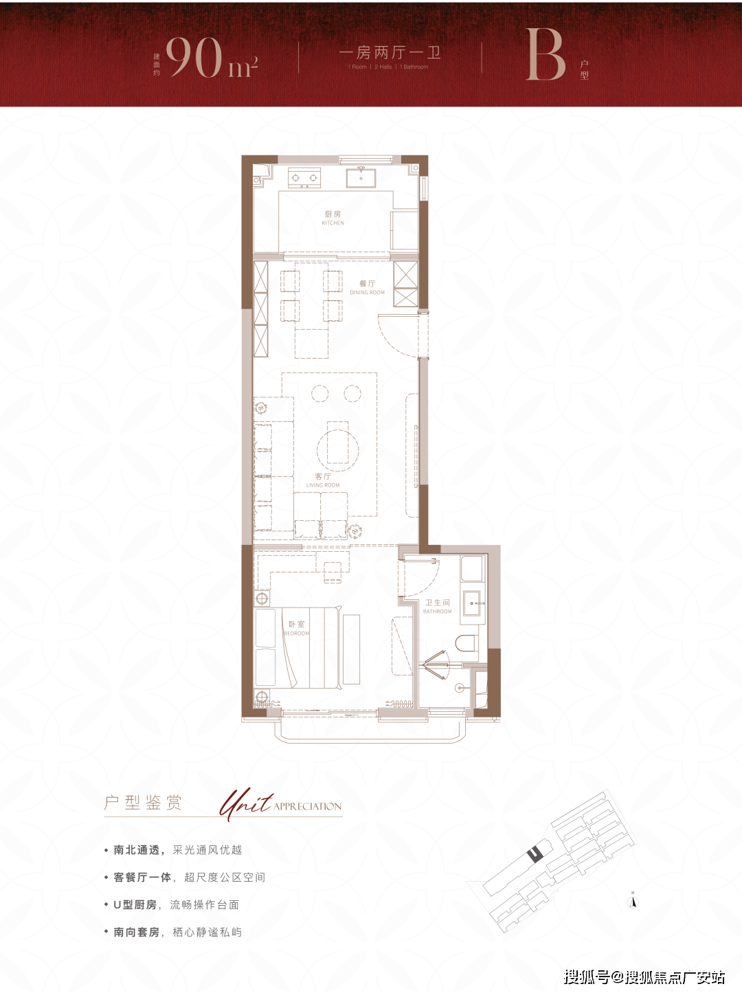 建面约90m²尊享1房户型,在100m²的基础上,进一步降低总价门槛的同时,也带来了设计上针对实用性的小巧思。