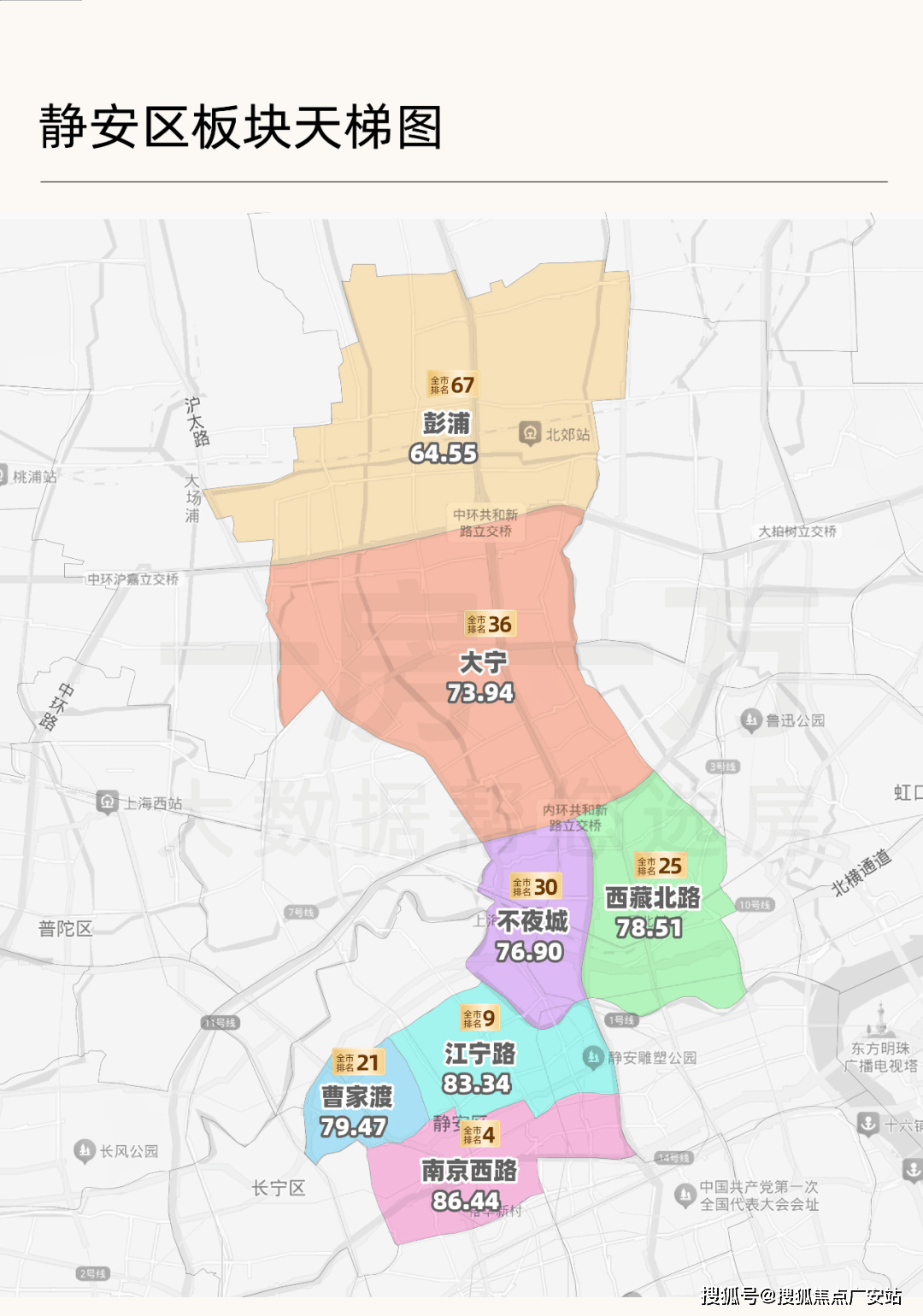 新静安借助产业政策和土地储备快速崛起,逐渐撕去闸北的下只角标签,大宁、苏河湾也一跃成为新兴中产及高端居住区。而老静安受限于城市界面老旧和更新缓慢,逐渐显露出疲态。
