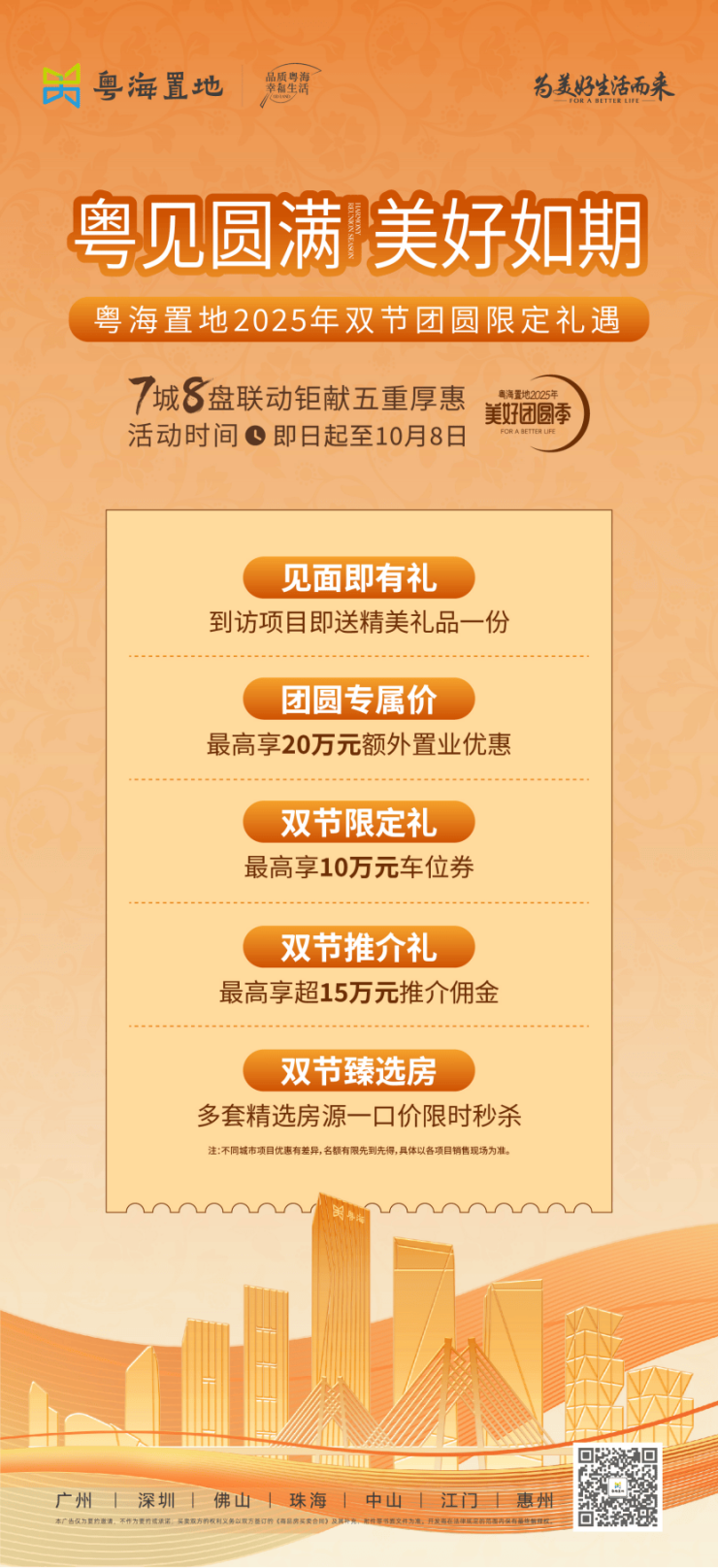 值此国庆、中秋双节来临之际,粤海置地诚邀每一位湾区人共赴美好,湾区7城8盘联合推出的“2025双节团圆限定礼遇”,以暖心礼遇助力每一个家庭的团圆安家梦想,让美好生活,如愿相伴。