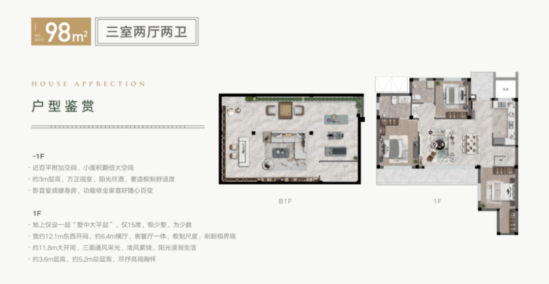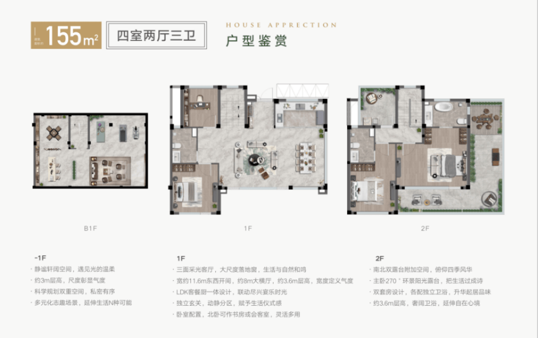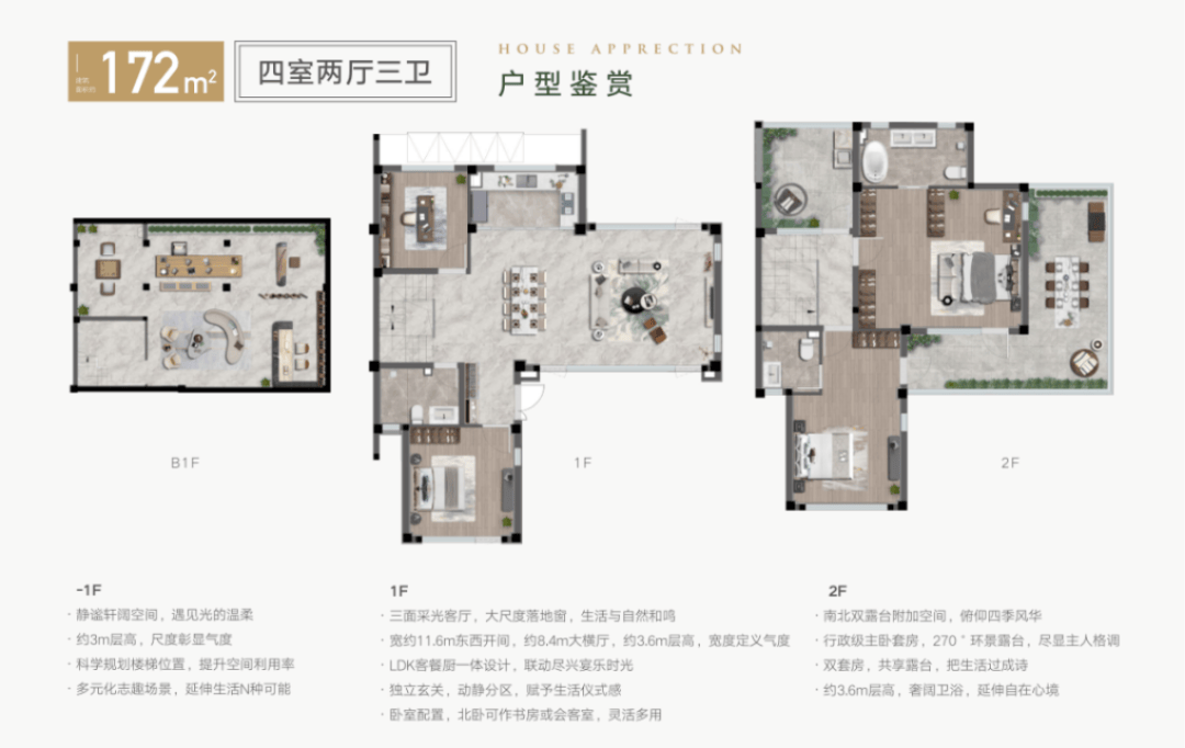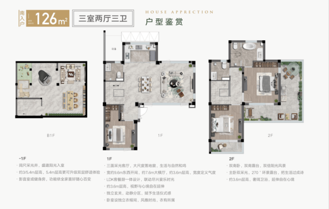 与此同时,居然做到了约3.6米的阔绰层高+270°转角露台+高度约3-5.4米、大尺度采光井的地下室。将视野景观进行全角度地拉伸的同时,更展示出真·别墅产品独有的气场。