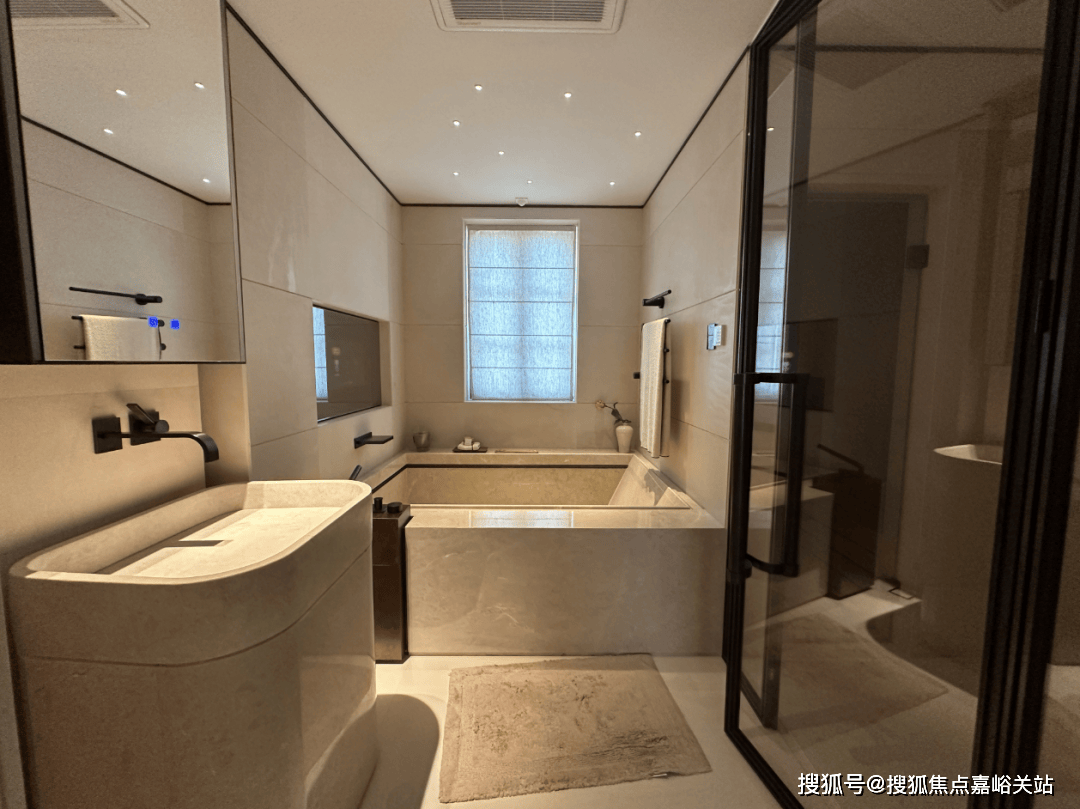 而样板间里这第二个卫浴空间,更接近于享受级。嵌入式浴缸,设计了魔镜系统,可以供业主泡澡时观影娱乐;除此之外,这个卫生间也有独立的淋浴房,并设计有桑拿房。