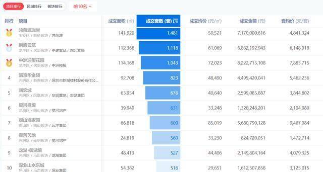 第九名、第十名则分别是龙湖御湖境、成交套数527套,深业山水东城、成交套数516套。