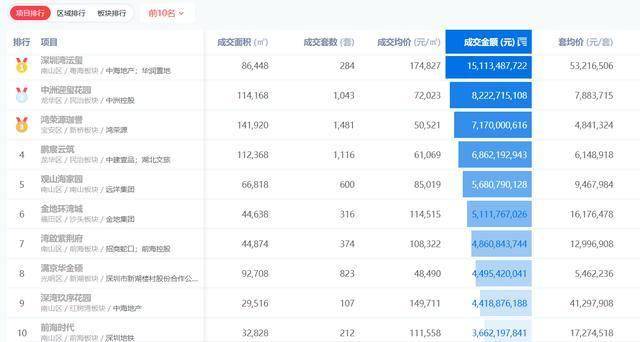 成交金额TOP10中,无论是成交均价,还是套均价仅次于排行榜首位的深圳湾澐玺。