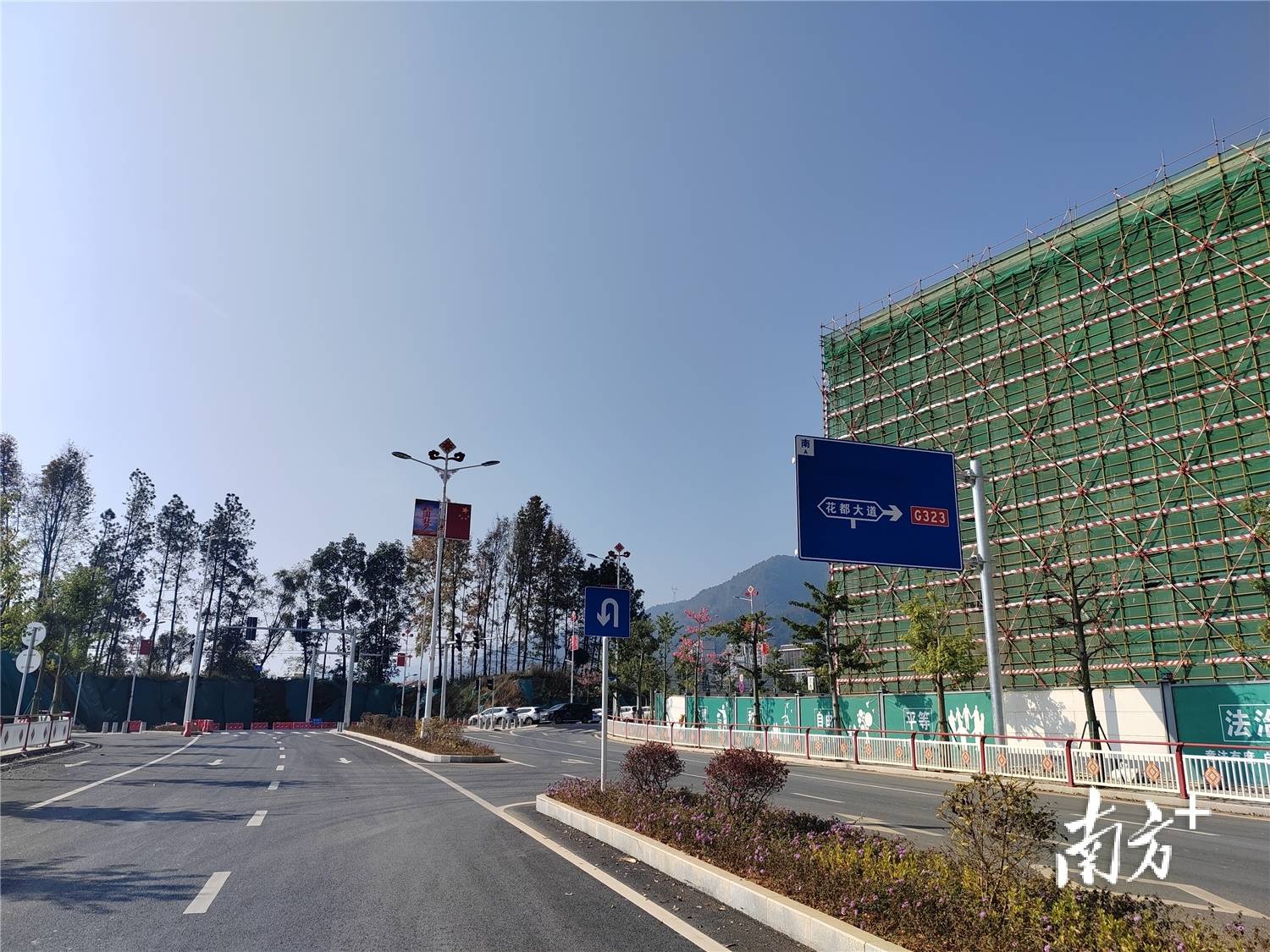双向四车道的花都大道铺上沥青、安装了富有瑶族特色的“瑶山红”路灯和护栏。南方+记者 陈国飞 摄