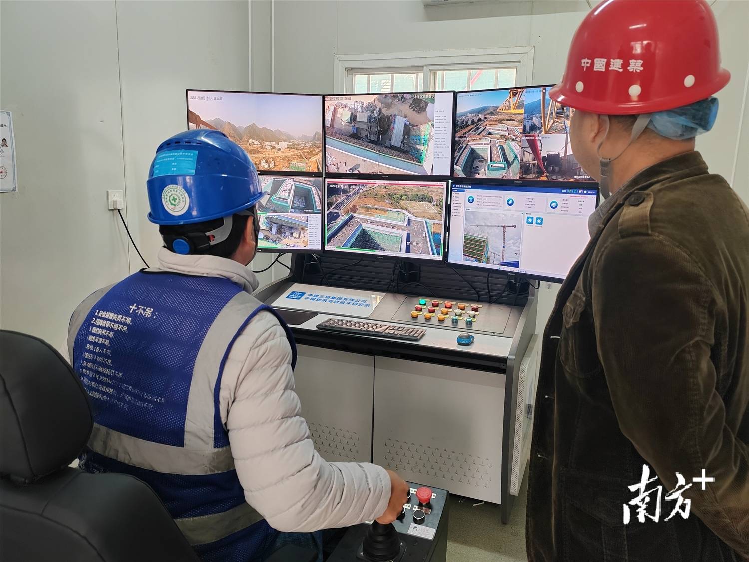 在项目工地一处操控室内,工作人员聚精会神紧盯着六个电脑屏幕、双手操控着椅子把手上的操纵杆与按钮,左右上下操作间,室外的塔吊就把材料从地上搬运到楼顶,不仅节省了人力,还避免了爬上爬下高空作业危险;在智能建造(应急)指挥中心,管理人员调取“AI安全着装管理系统”即可了解安全着装率,查看未带安全帽、未穿反光衣的实时抓拍记录……
