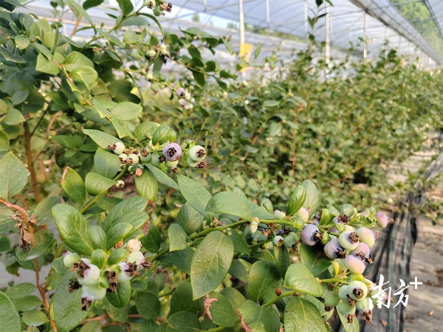 在花都帮扶连南5G盆栽蓝莓种植基地一期(安田试验种植基地)项目的大棚内,一排排的蓝莓茁壮成长,已长成约半个成人的高度,一串串白色的小花挂满枝头,其中有不少已经结出青紫色的果实。