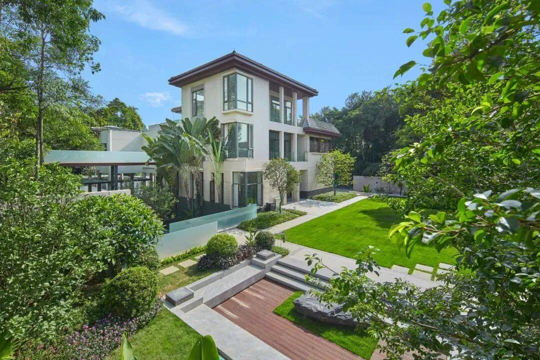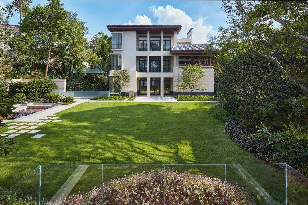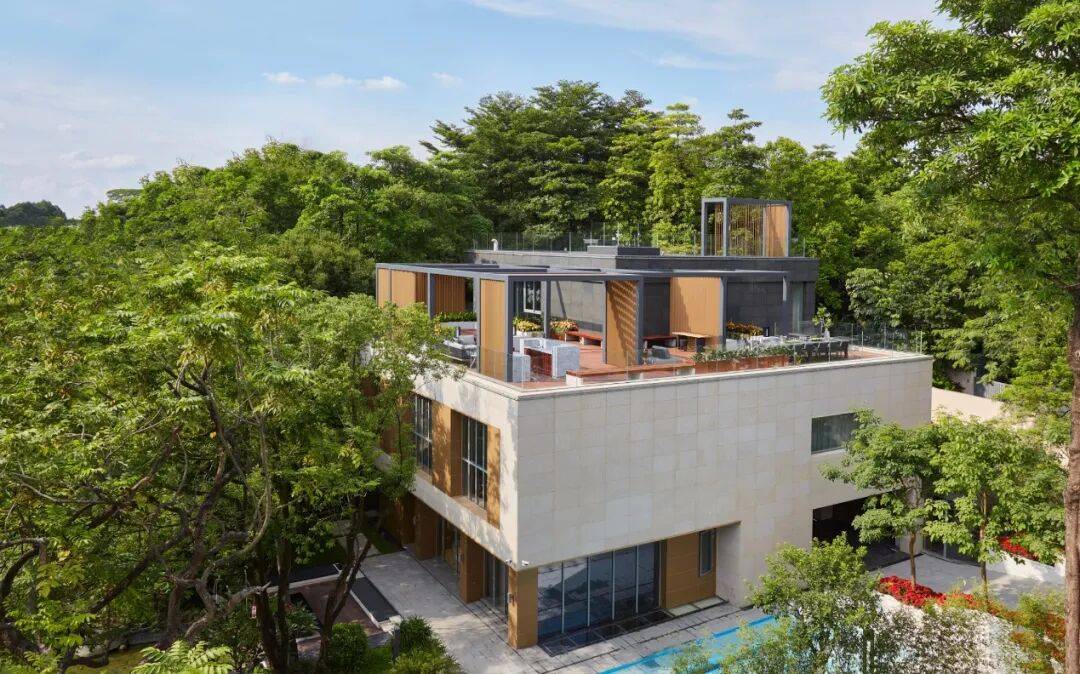 S22「叠翠阁」由全球顶级设计事务所美国NBBJ操刀设计,总建面约为951㎡,相比以往的大面积独栋,S22「叠翠阁」位置更佳,一脉连着白云山,一面连着天鹅湖。首层的庭院打造了泳池区、品茗区、观湖区和自然博览区四大主题区域,景观设计独具匠心,建筑和自然和谐共生。