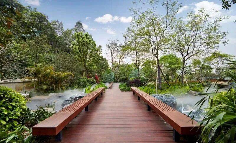 其承大国之院落,取云山之厚重,打造现代版履道坊——花溪谷,绿植山体环绕,重点打造瀑、潭、溪、涧、湖等不同形态的水景,配以桥、亭、阶、坡景成就一座院藏云山的大美园林。