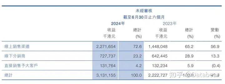 从2024年中期财报来看,蓝月亮线上销售渠道同样表现亮眼,收益同比增长7.4%。和直销大客户以及线下分销两个渠道相比,线上销售渠道收益取胜明显,占比72.6%,达22.72亿港元。这一成绩和2023年的全年财报相呼应,截至2023年12月31日,蓝月亮线上销售渠道收益占总比的52%。