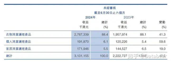 或许是之前迭代洗衣粉的策略让蓝月亮尝到了甜头,也让其对“固守”洗衣液战场的策略更加自信。2024年中期财报显示,上半年蓝月亮来自衣物清洁护理产品的收入达到27.67亿港元,占比总收益的88.4%。