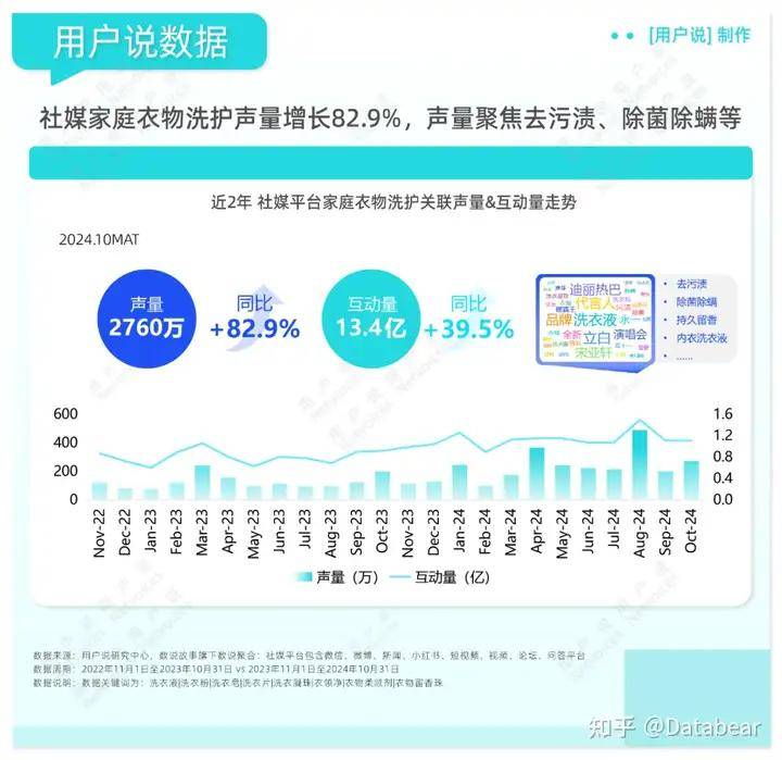其中,洗护类产品是不少消费者在“双11”期间的常见囤品。且用户说监测发现,消费者家庭衣物洗护品类需求持续高涨,作为日常刚需品展示出了强劲的经济周期发展韧性——近两年社媒平台中,该赛道产品用户声量、互动量持续走高,分别以82.9%、39.5%同比增长率达到2760万、13.4亿,声量聚焦去污渍、除菌除螨等。