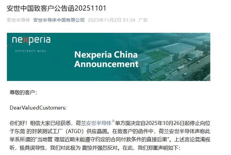 11月2日凌晨,安世半导体中国有限公司发布“安世中国致客户公告函”,称荷兰安世半导体单方面决定自2025年10月26日起停止向位于东莞的封装测试工厂(ATGD)供应晶圆。荷兰安世半导体声称此举系所谓的“当地管理层近期未能遵守约定的合同付款条件的直接后果”。安世中国对此强烈反对。