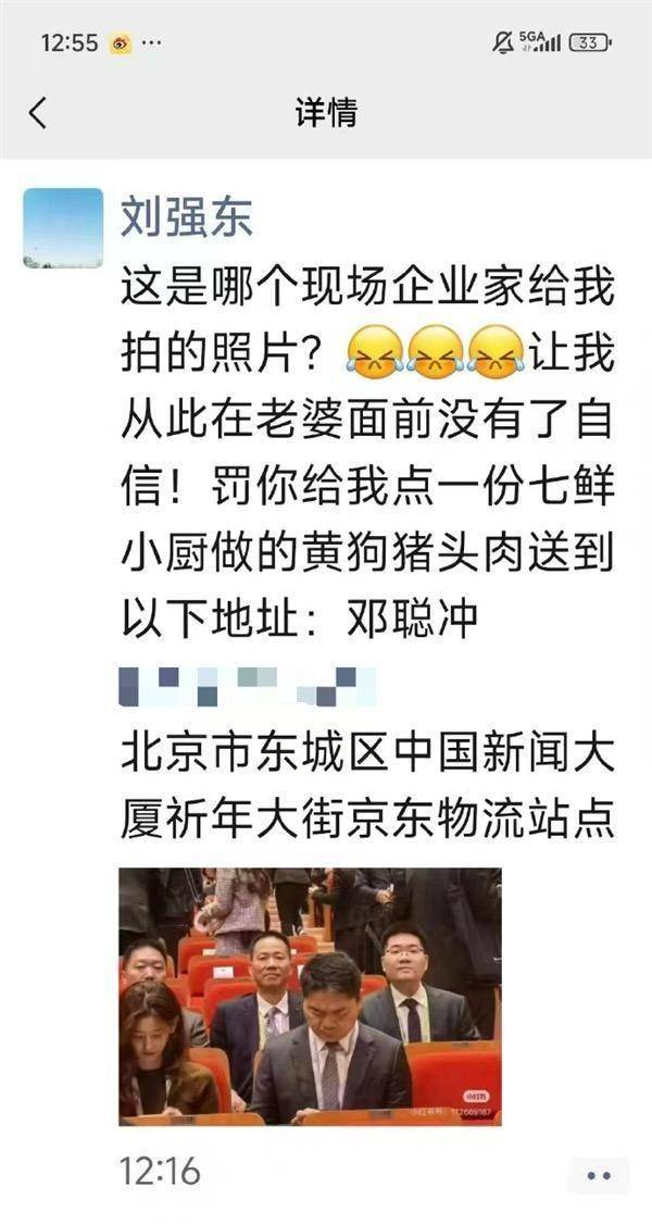刘强东太会玩营销了!调侃在章泽天面前没有自信,朋友圈预留电线日消息,据媒体报道,日前,“刘强东请吃外卖的邓聪冲是谁”话题引发网友热议。据悉,刘强东与妻子章泽天近日一同出席APEC峰会,现场有参会人员拍下了两人的合照:刘强东低头查看手机眉头紧锁,而章泽天则表情在线。刘强东随后在朋友圈调侃:“这是哪个现场企业家给我拍的照片?让我从此在老婆面前没有了自信。罚你给我点一份七鲜小厨做的黄狗猪头肉,送给邓聪冲。”