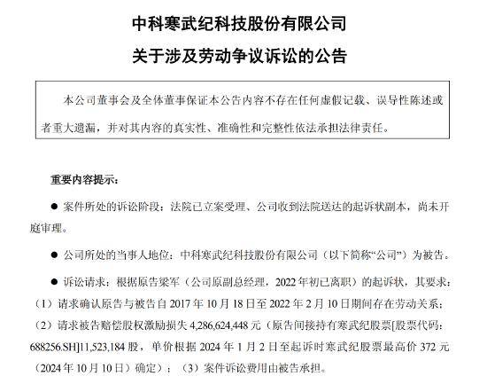 11月1日消息,日前,寒武纪突发公告,称遭前副总经理、CTO梁军以劳动争议起诉,索赔42.87亿元,该金额是公司2024年营收(11.74亿元)的3.6倍、2025年上半年营收(28.81亿元)的1.5倍。目前案件已立案受理,但尚未开庭审理。