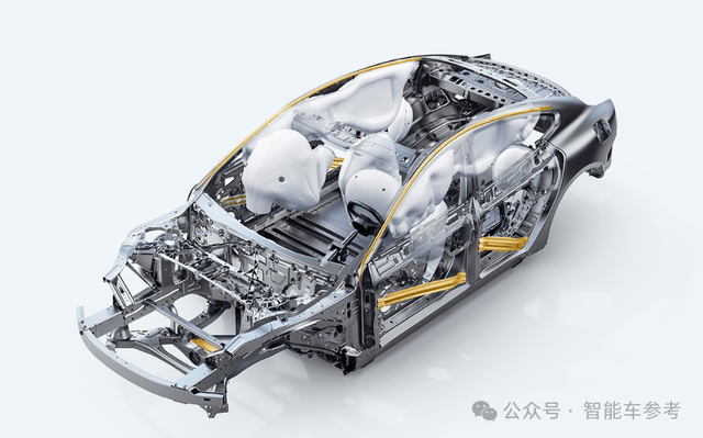 全系升级为2200MPa超强钢,电池包底部加入1500Mpa防刮横梁和防弹涂层。